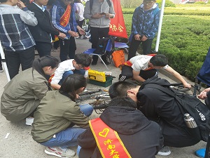 活动还未开始,修车队成员便是早早赶到场地进行布置。炎热的天气炙烤着修车队成员,他们并没有抱怨什么,一直在认真的工作。志愿者们准备工作完成后,来往的同学们陆陆续续赶到这条街道,去体验志愿者活动的各项内容。修车队的活动内容不仅仅是修车,他们还准备了有奖答题和青协智能机器人展示。有奖答题的问题大多是关于志愿者的工作内容、注意事项以及各学科知识的问题。他们展示的机器人可以探测周围的障碍物,并进行躲避,吸引了不少同学的注意。当然,此次修车队最重要的活动内容是修车,虽然自行车在生活中随处可见,但是想要对自行车有全面的了解可不是一件简单的事,修车队的成员们互相配合,有条不紊的修车也是吸引了很多同学的注意力,他们也向感兴趣的同学解释了相关的内容,引来一片叫好声。