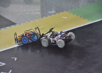 上午八点半,比赛选手及工作人员各就各位,在比赛正式开始之前,参赛选手代表抽签,选择比赛场地,接着裁判员对参与擂台赛的机器人进行称重以及尺寸的测量,符合比赛标准机器人正式参与比赛。随着裁判的一声令下,A、B场地的选手分别启动各自的机器人,机器人发出“嗡嗡”的响声,向着对方的机器人疾驰而去。双方的机器人在擂台上进行着激烈的较量,直至其中一方的机器人被推下擂台,胜利者得1分,比赛持续五分钟,积分多者获得胜利。机器人擂台赛一共分为三个大组,每组的第一名再进行冠军的争夺,最终beat365中文官方网站共获得一等奖项三个,二等奖项五个,三等奖项四个。
