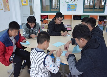 弘扬传统美德,搭建爱心桥梁。为了更好的激发孩子们对于纸飞机的兴趣,队员们早早地购买了纸飞机的原材料并讨论折纸飞机的各种方法。斜风细雨并没有阻挡队员们的脚步,他们于下午2:20到达泺源学校。孩子们看到队员们的到来显得非常高兴,随后孩子们在老师和队员们的陪同下来到教室开始今天的课程——折纸飞机。孩子们在志愿者的帮助下学习折纸飞机的步骤,他们从裁纸到折纸的每一步都格外专注,尽管出现了很多失误,但孩子们并不气馁,他们每一次出错都会向志愿者请教,然后继续认真的折纸飞机。随后,孩子们陆续完成纸飞机的折叠制作,他们开心的展示自己的作品,特别是男孩子,聚在一起比赛谁的飞机飞的远。虽然他们存在着一定的智力障碍,但其实他们和普通的小朋友一样天真可爱,都会认真学习知识。