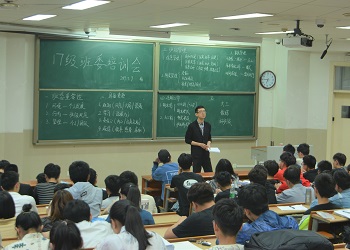 培训前,杨老师将会议关键点板书在黑板上。杨老师从环境对个人发展的影响,班委行为对班级风气的影响强调了班委的重要性和职责,从而引出一名合格的班委应该从政治思想、学习、责任心和威信四个基本素质上来增强自己,只有这样才能真正了解班级同学所需,对症下药,高效完成班级任务。随后,杨老师从信息传递,制度完善与日常事务三个方面就班级管理结合各班级实际情况和一些解决问题的思考方式、技巧对大家进行培训,同时希望各班级健全管理制度,对待班级任务不拖拉,不打折扣。培训会最后,杨金鑫老师对四级通过率及期末考试提出进一步要求,强调班级整体不断上升才能体现班委能力的提升,希望各班级成绩越来越优异,整体越来越团结。晚七点三十分,培训会结束。