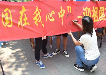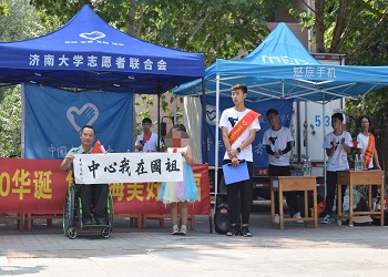 祖国七十华诞在即,为加强学生的爱国主义和民族主义精神,营造校园热烈的节日气氛,9月7日上午,beat365中文官方网站青年志愿者协会联合各院青年志愿者协会共同在beat365中文官方网站的八食广场组织了此次庆祝活动,其间不仅邀请了学校老师以及山东英雄战歌文化传媒有限公司李惠董事长,还邀请了及抗战老兵武连庆和他的战友们,一同为祖国的七十华诞献上自己的祝福,并引导同学们树立正确的人生观、价值观,培养同学们以爱国主义为核心的民族精神。