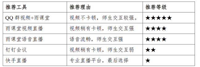 beat365官网青年教师段德荣老师,在网络授课的方法和准备上投入了大量的精力和时间探索,他利用超星、雨课堂、腾讯课堂、腾讯会议等多种授课工具,多次测试了不同学生人数、不同时段,以及多工具相结合的授课方式。他制作的《网络教学基本操作规范》被济大教师发展中心在教师群内推广;近期他又为beat365官网师生制作了《课前准备篇》,诙谐的把课堂资料比喻成“粮草”、授课平台和工具比喻成武器。为了让老师更好的应对网络卡顿等问题,他整整介绍了五套授课方案做备选,并比较了优劣,见表1。