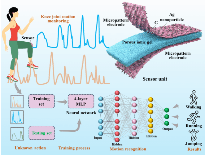 柔性可穿戴设备因其在可穿戴传感器、智能显示器、健康诊断和治疗、电子皮肤、人机交互和能量采集方面的潜在应用而引发了研究兴趣。其中,可穿戴电容式压力传感器以其简单的器件结构、可靠且能耗相对较低而备受关注。到目前为止,在提高电容传感器的灵敏度方面已经取得了重大进展,但实现具有超高灵敏度和大工作范围的人类健康监测,以满足从微小变形(如脉搏跳动)到重大变形(如人体关节运动)的全面医疗和保健生物监测仍然具有挑战性。同时,大多数报道的传感设备都是在致密、气密的弹性基底上制造的,该基底缺乏透气性,这阻碍了皮肤与外界之间的热量和气体交换,使其不适合长期佩戴(导致皮肤积热,甚至红肿和炎症)。为了提高透气性和穿着舒适性,已经研究并报道了基于织物(如棉布、无纺布等)的传感器。然而,织物的厚度和体积较大,阻碍了传感器与人体皮肤之间的粘附和后续工作。织物具有天然的亲水性,长时间穿着会导致汗液进入传感器,削弱传感器的传感性能。在此,该工作设计并制造了一种基于多孔离子电解质和微观结构的高灵敏度、宽检测范围的透气疏水性离子电子压力传感器。该传感器是在具有微凸起的多孔离子电解质被两个微图案的Ag/G/TPU纳米纤维电极夹在中间之后实现的。由于微观结构的制备和超级电容工作原理的引入,制备的电子传感器表现出超高的灵敏度(21.3kPa-1)、大的工作范围(0.30-106 kPa)、极低的检测限(约40 mg)以及显著的可靠性和耐用性。由于纳米纤维电极中丰富的微孔结构和多孔电解质,所制备的传感器具有较高的透气性(25.02 mm/s)和透湿性(102.35 g/m2h),提高了长期佩戴的舒适性。同时,TPU纳米纤维的天然疏水性(接触角约为155.1°)赋予了传感器优异的防汗性,可以有效防止汗液侵蚀传感器。此外,该传感器已成功应用于人体膝关节运动监测和二维压力检测。在构建神经网络算法的帮助下,它可以识别人类的行走、跑步、跳跃等动作,成功率为100%。这项工作有望为下一代人造电子皮肤中可穿戴、透气、疏水、高灵敏度和宽范围压力传感器的制造铺平道路。