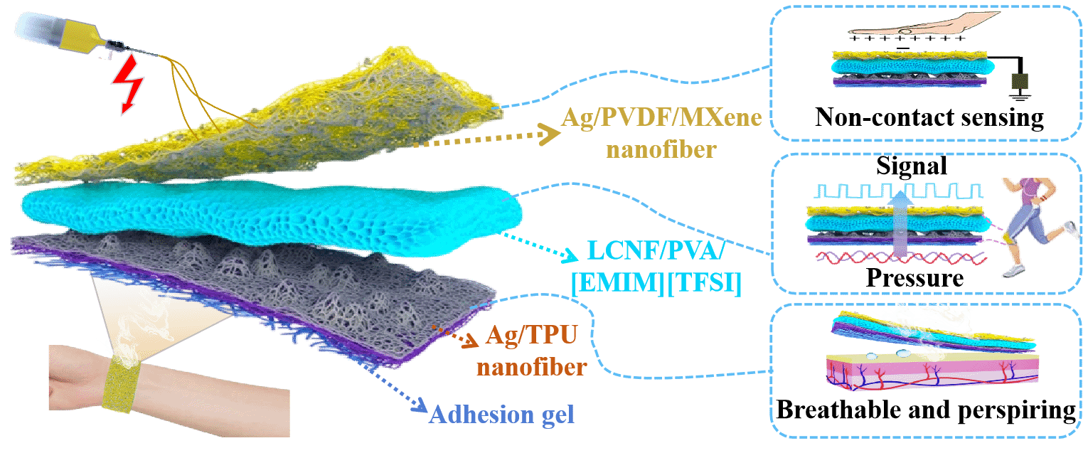 电子皮肤在可穿戴传感领域的应用前景广阔,近年来发展迅速。具有透气性、自粘附性、排汗性和多种传感功能,但在单一设备上无法实现。为此,该工作受天然人体皮肤的启发,开发了一种基于全纳米纤维平台的透气自粘电子皮肤,具有独特的定向排汗性能和双功能压力和非接触传感能力。该成果以具有良好透气性的静电纺丝纳米纤维为基底,研制了一种具有独特的定向吸湿-排汗性能和双功能压力和非接触式传感能力的透气自粘传感器。该传感器不仅具有23 kPa-1的高压传感灵敏度和2米的超宽非接触检测范围。该传感器还具有53.9 mm s-1的优异透气性和快速排汗能力。该传感器在皮肤温度下可以紧密附着在人体皮肤上,在高温下使用温控可逆相变凝胶可以很容易地剥离。